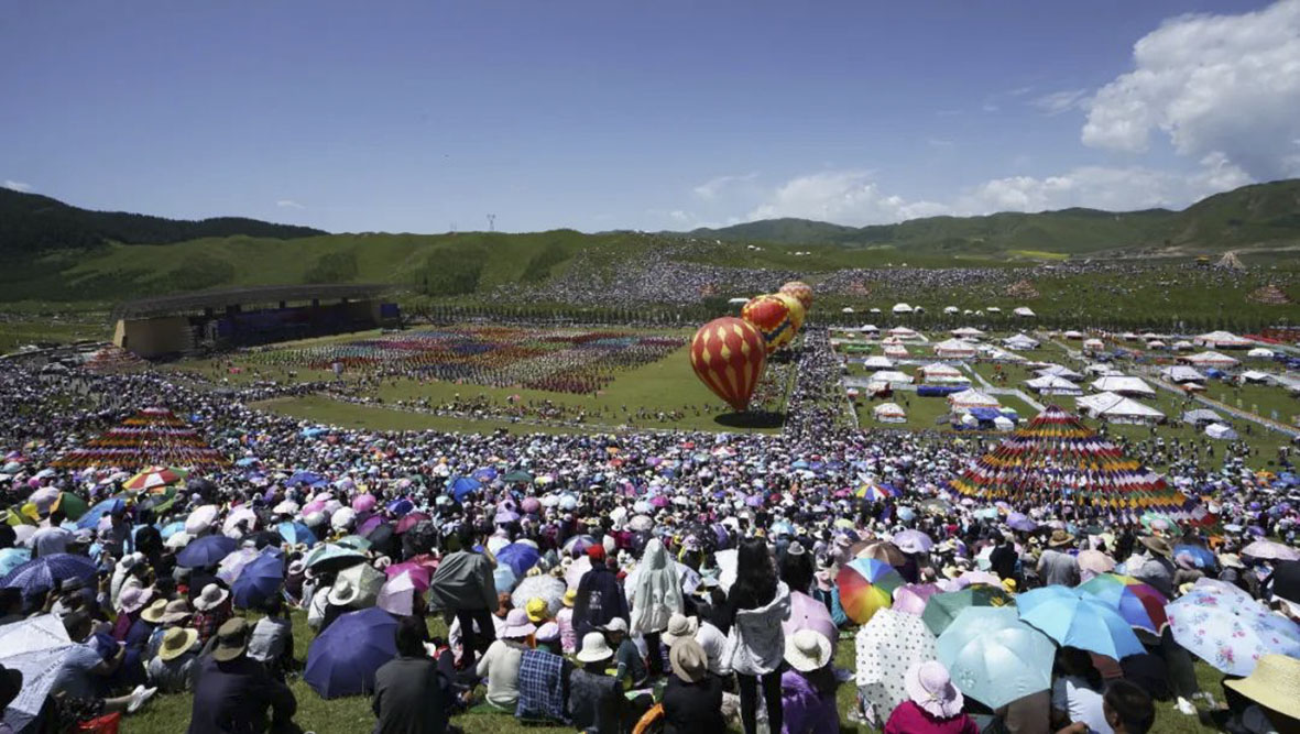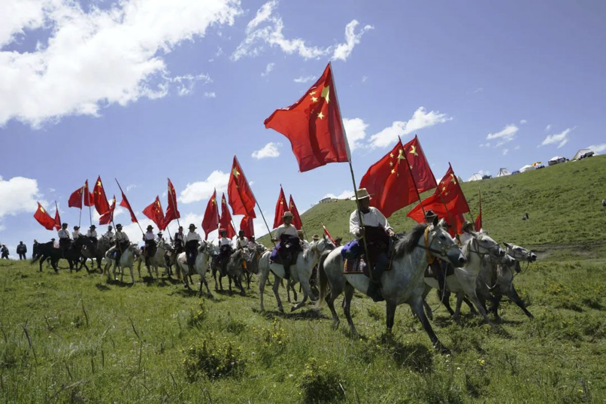 2019年7月29日,甘肃省甘南藏族自治州合作市当周草原,手持国旗的当地牧民群众组成马队参加九色甘南香巴拉旅游艺术节开幕式表演