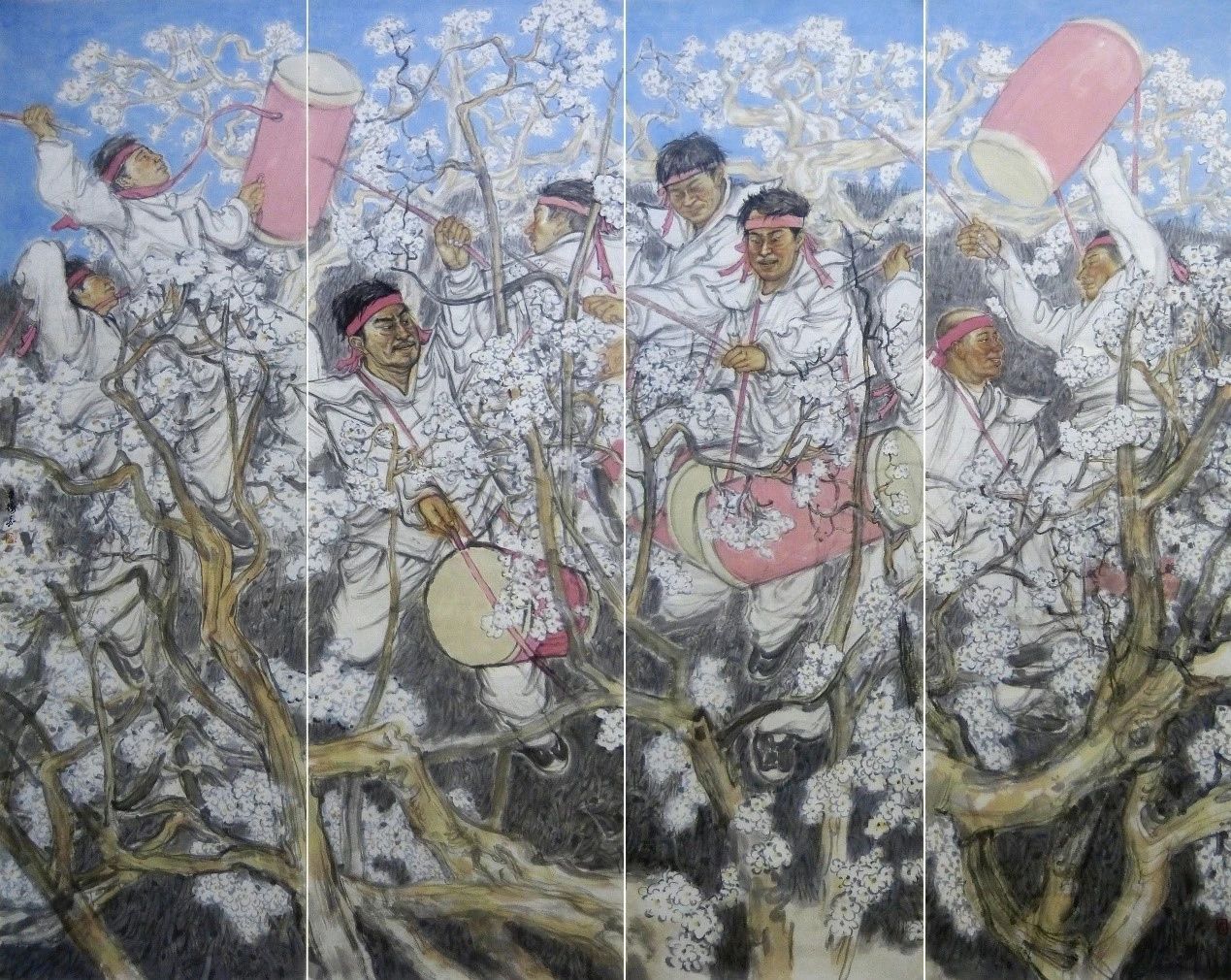 中国画《梨园春醒》以中国人物画独特的表现技法,结合西画强烈的色彩对比,把较为写实的人物和装饰感的梨花构成在同一画面场景中,动静结合,突出了主题作品中更加浪漫的一幕。主色调明快协调,以红、兰、白色及淡墨色调烘托画面气氛,符合人们的审美意向,表达了劳动人民欢乐的喜庆场面的。
