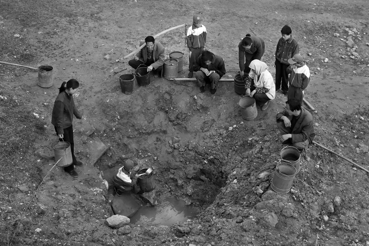 2006年05月06日,甘肃省渭源县大安乡邱家川村,村民蹲守在山眼泉四周等待舀水。