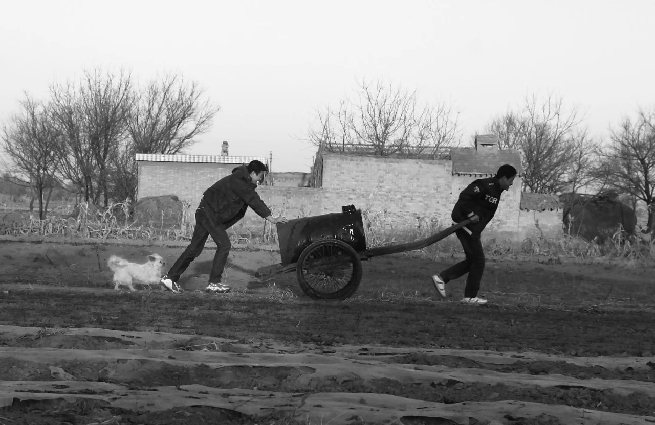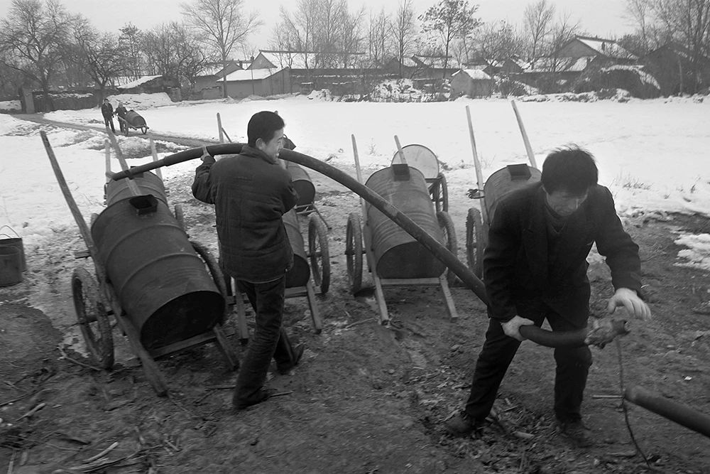 2011年02月04日,甘肃省正宁县榆林子镇小寺头村,傍晚俩小伙从机井拉水回家。