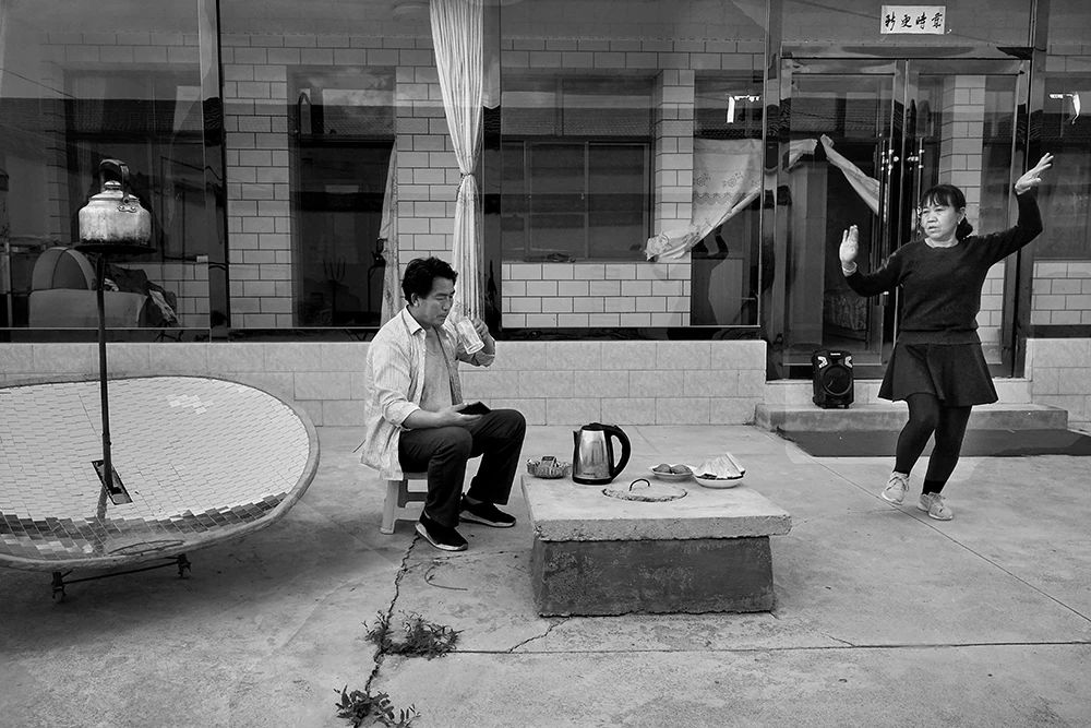 2019年07月17日,甘肃省会宁县太平店镇大山川村,村民董永恒坐在院子喝水,妻子杨丽琴跳着广场舞,脱贫致富促进村民物质生活和精神生活共同富裕。