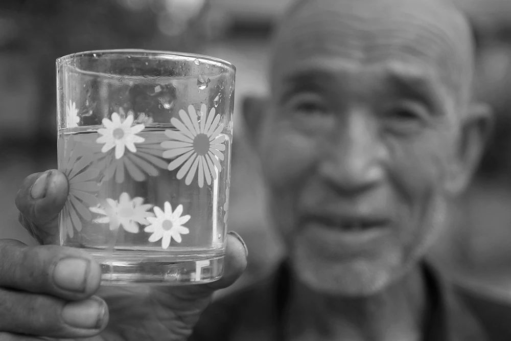 2018年07月23日,甘肃省正宁县榆林子镇小寺头村,老人手里端着清澈透明净化后的纯净水。