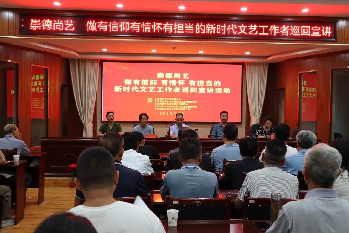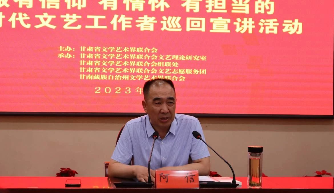 为配合中国文联文艺援藏项目,用文艺赋能铸牢中华民族共同体意识,推进民族文艺工作高质量发展,8月21至24日,甘肃省文联“崇德尚艺 做有信仰有情怀有担当的新时代文艺工作者”巡回宣讲团赴甘南藏族自治州各县开展巡回宣讲活动,甘南藏族自治州各县市文艺工作者800余人在现场听取了宣讲。