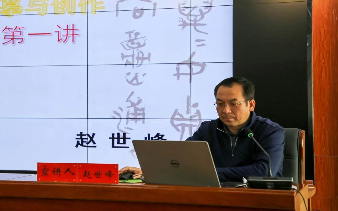 甘肃省书法家协会篆书专业委员会副主任 、一级美术师赵世峰就《书法审美的四个维度》,从笔法的力量感、形与势的关系、空间构成讲解了书法的笔法之美,从汉字的结构规律及动态变化分析了汉字的空间之美,从书法是视觉艺术、章法所遵循的艺术表现规律解读章法之美,从古代经典作品中分析如何通过墨色的变化,来表现书法的“色彩”和神采。